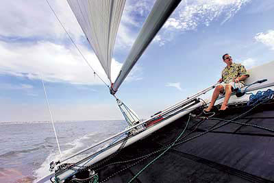 The wind is hovering around 7 knots - barely a breeze - and Randy's racing at twice that, using the mainsail and the rudder to balance the cat on the edge of capsize.