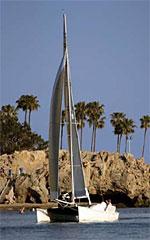 FROM ALAMITOS BAY Randy Reynolds is skimming across the water at what looks like a 45-degree angle, flying the windward hull of the Cat Attack six feet off the surface.