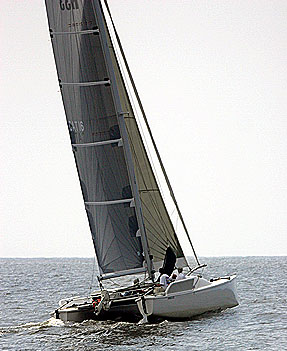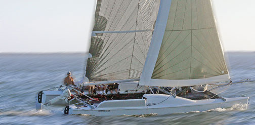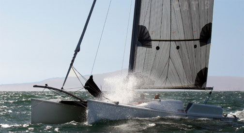The result is a lightweight cat with five fast sails and a minimum of accommodation. It can jibe around a buoy like a windsurfer, then hit 25 knots downwind. All for $136,070.