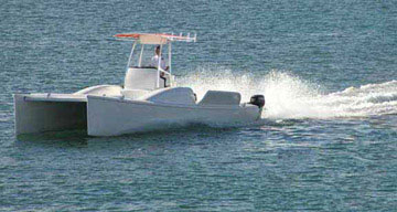The Reynolds Powercat currently is set up to carry twin 60 HPs, but will soon be equipped with twin 90s which Reynolds believes will enable the boat to cruise at speeds around 28 knots. Due to its lightweight construction, the boat boasts gas mileage between 4-7 miles per gallon. Its open deck allows ample room for guests, family or fishing buddies as the case may be and it also has sleeping quarters suitable for 4 adults.