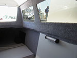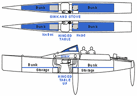 I hvert skrog får du usjenert privatliv, to store enkle køyer, et toalett, en kjøleboks og mulighet for å lage mat på et gassbluss. Med dekksluken lukket har du en takhøyde på 1.60 som kan økes til 1.90 med luken i ventilasjonsstilling. Under køyene er det stuerom med god plass til utstyr og klær.